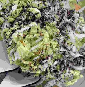 I didn’t have time for Turkey Chili’s mess (Mess rated 2/4) but did make Miso Honey Mustard Baked Chicken (p. 140-141) to serve at a Ladies Game Night I hosted. Huge hit, so big, that I’m planning to give the cookbook as a holiday gift to each of the three ladies who attended. The chicken was savory and sweet from its marinade of Kewpie mayo, miso and lemon, a side of cabbage with furikake so simple and so delicious, I don’t know why I didn’t think of it sooner.