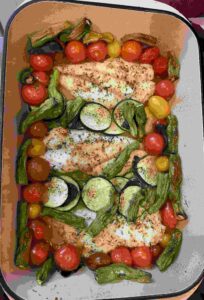 Bitter complaints were uttered when I told my 13-year-old that I was making One-Dish Halibut with Summer Vegetables (p. 128-9) for dinner. I did not have time to shell the fresh peas I had from the farmers’ market but no matter, the shishitos, tomatoes and zucchini I layered into my Le Creuset lasagna pan offered more than enough veg for the dish. Seasoned only with S&P, lemon juice, and fresh basil, the flavors were simple – I sprinkled fresh thyme for added oomph and served with tartar sauce on the side. The pre-meal complaints from said 13-year-old were silenced after the first bite.